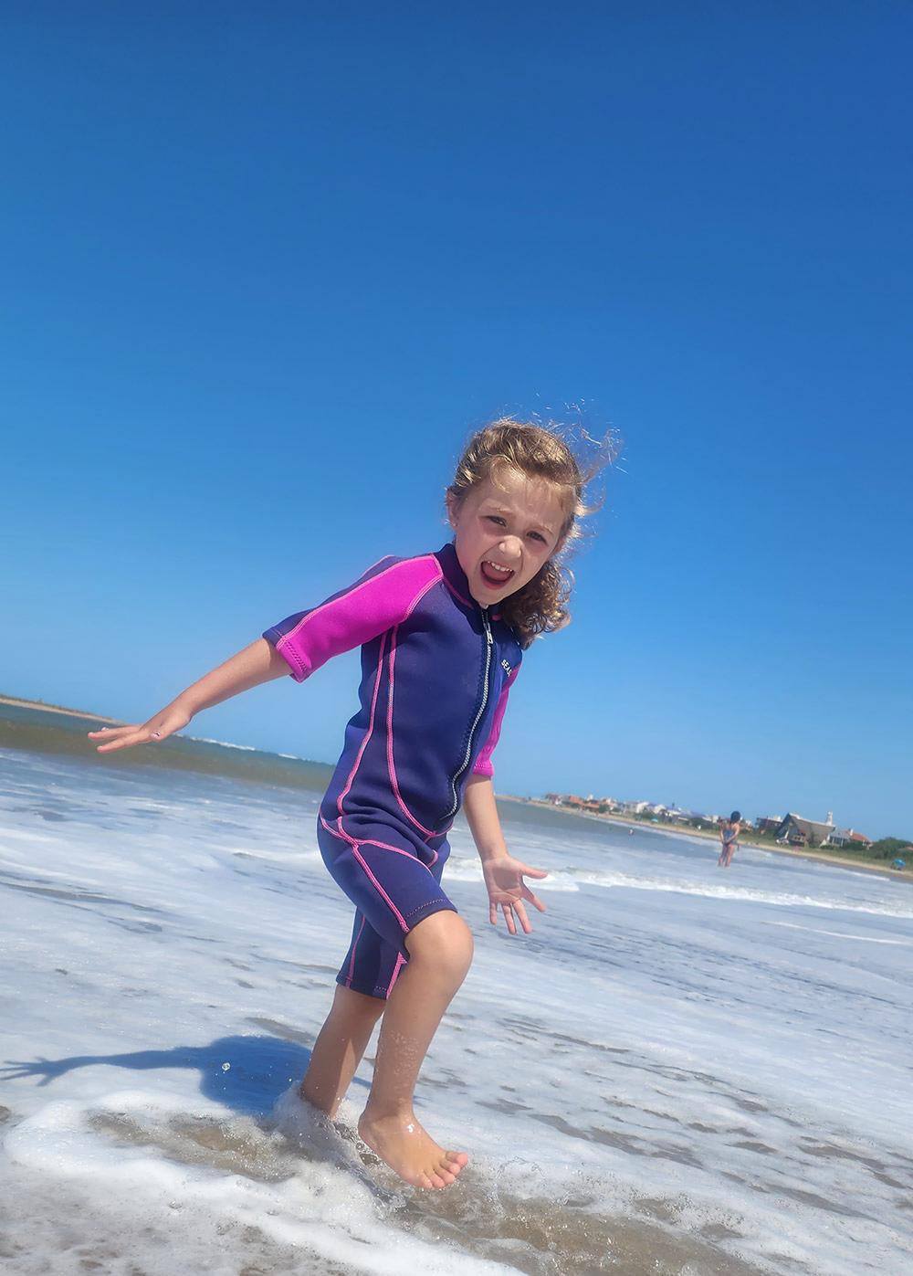 The material of Seaskin kids wetsuit is super soft and stretchy so it will last a bit and grow with him/her a little. It stretches and is close to the skin which is great for retaining warmth. Kid will enjoy playing in a 'not so warm' swimming pool, enjoying jumping in the ocean or doing more beach water play like bodyboard. And more, the sand stays out of their body and easy to clean.