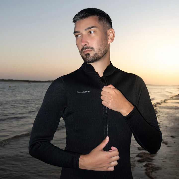 The mens wetsuit jacket offers reliable insulation for cold-water adventures. Crafted from high-quality neoprene, it retains body heat while providing flexibility for unrestricted movement, ensuring comfort during extended dives, surfing sessions, or open-water activities.